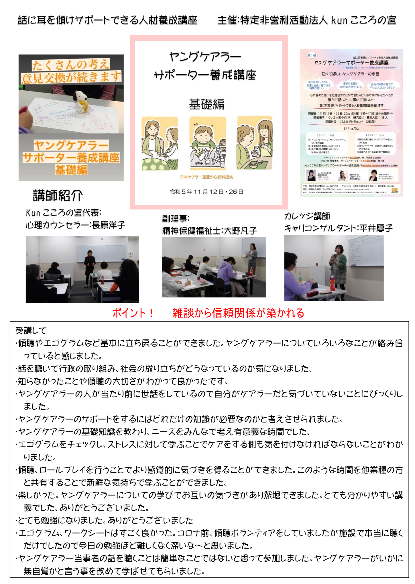 今回の講座開催で、安心できる環境作りができたように感じれたこと うれしく思いました。