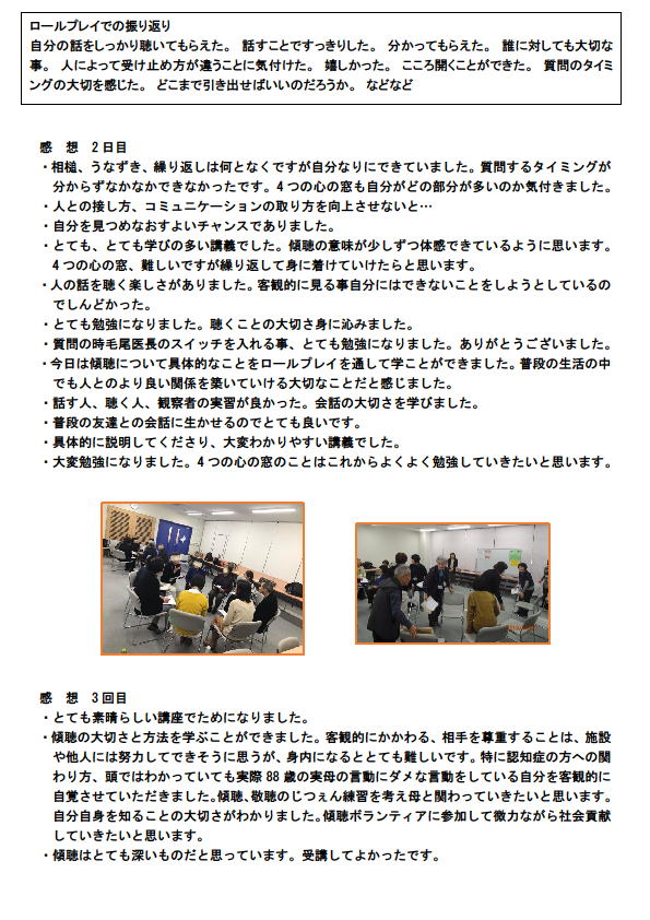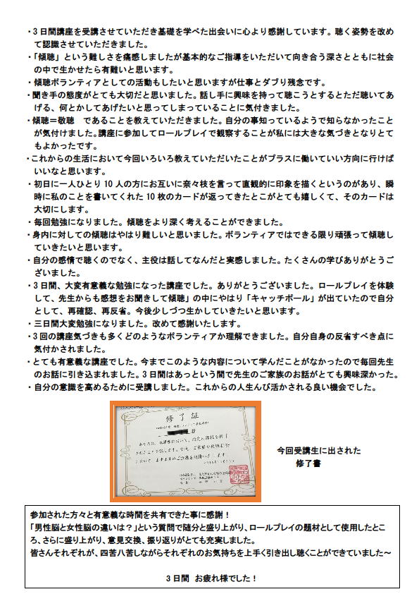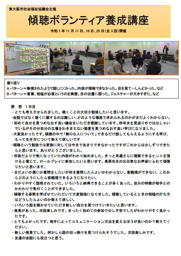 東大阪市社会福祉協議会主催 傾聴ボランティア養成講座 2019年11月11日・18日・25日 開催