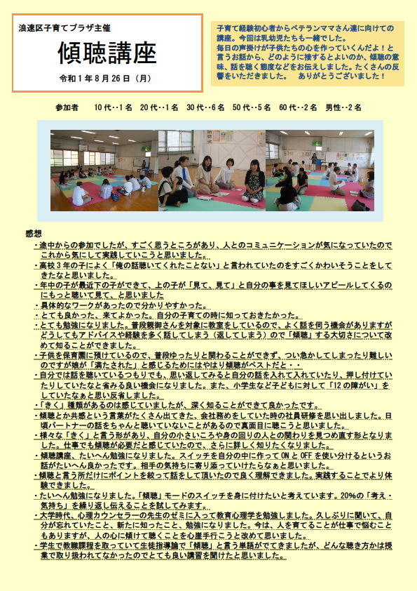 浪速区子育てプラザ主催 傾聴講座 2019年8月26日 開催