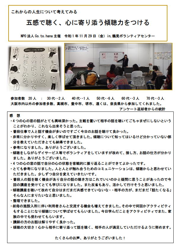NPO法人Co.to.hana主催 五感で聴く、心に寄り添う傾聴力を付ける講座 開催
